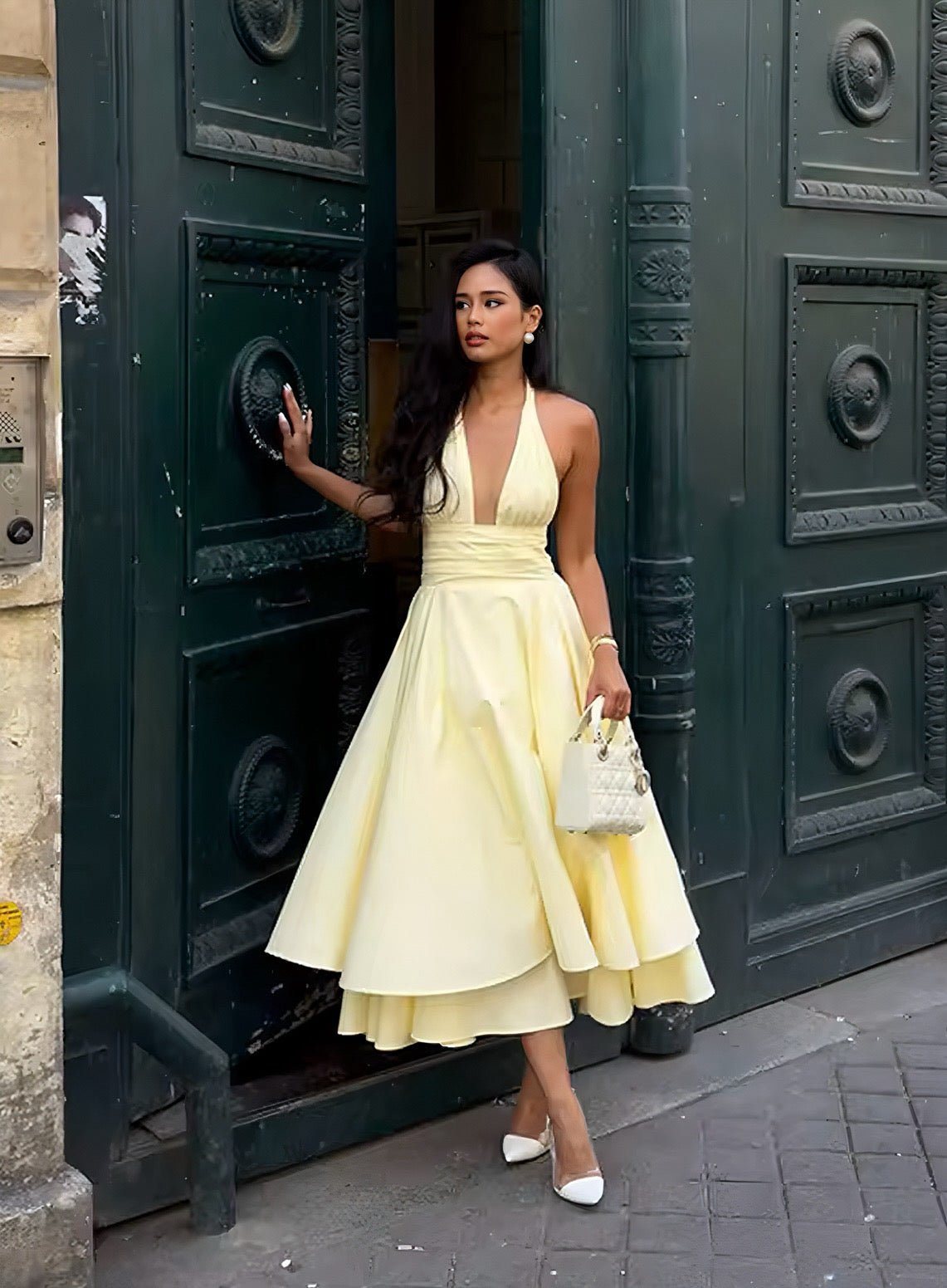 Déjate envolver por la suavidad y la feminidad que este vestido en delicado tono amarillo "buttercream" te brinda. Este diseño es perfecto para aquellas que buscan un estilo fresco y romántico. Con favorecedor escote halter que se anuda con delicadeza en la nuca, revelando una espalda elegantemente abierta. El corpiño fruncido y ajustado en la cintura, crea una silueta definida y femenina, mientras que la falda Midi de capas escalonadas añade volumen y movimiento etéreo.