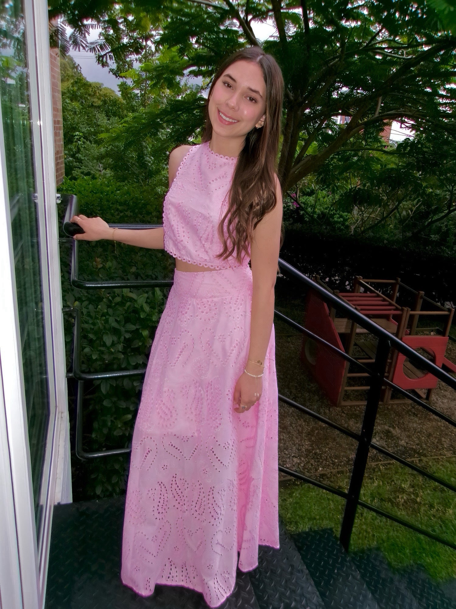El top estilo crop de cuello redondo y bordes festoneados se complementa perfectamente con la falda larga de corte fluido creando una silueta armoniosa y juvenil.