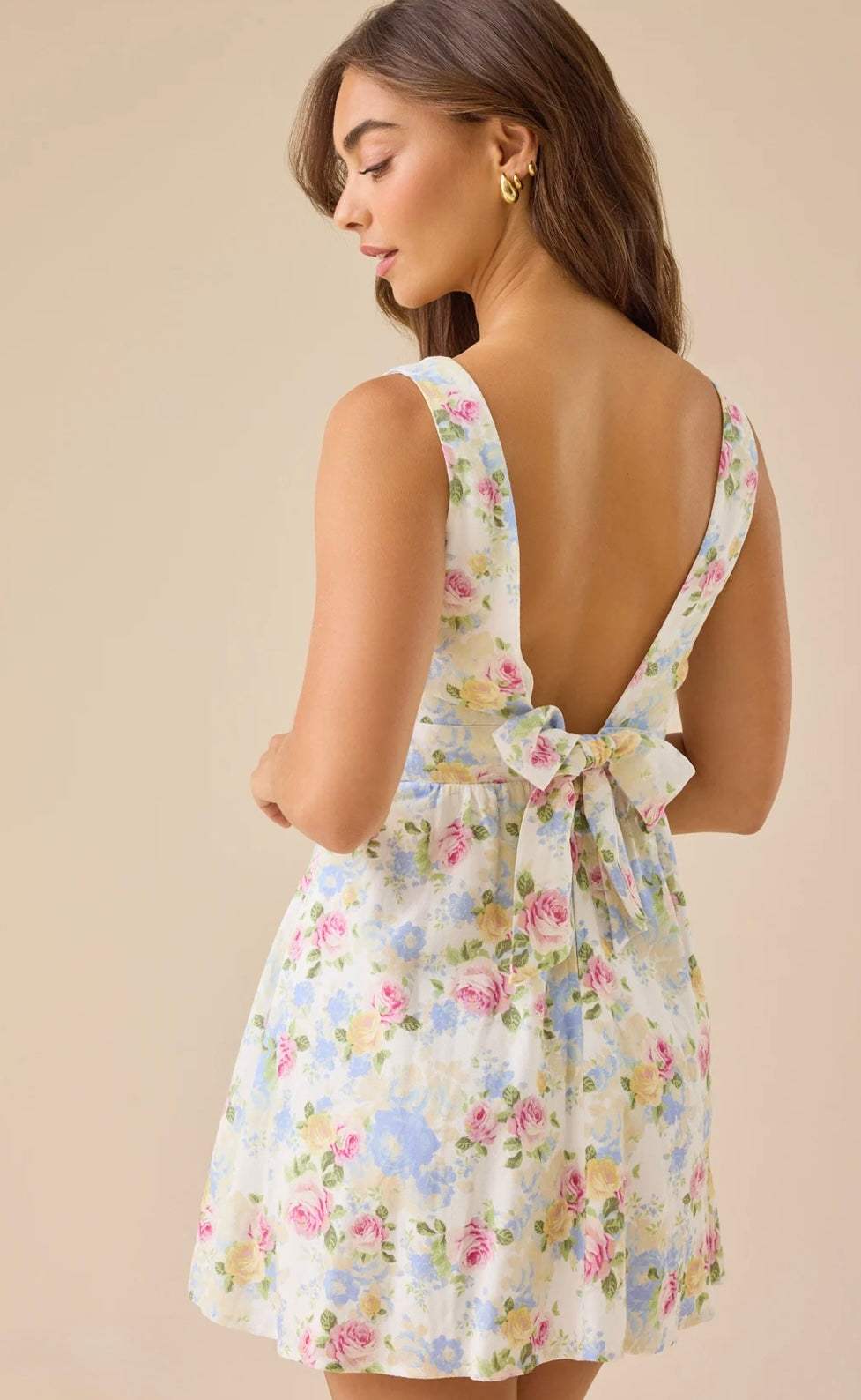 Hermoso vestido mini con estampado floral. Corte en "V" y delicadas aberturas "cut-outs" laterales, a la cintura, que aportan un toque coqueto y moderno al diseño. Confeccionado en rayón y lino con una hermosa espalda descubierta y un delicado lazo en la parte baja, hacen de este vestido una femenina y delicada opción para lucir en tus eventos casuales.