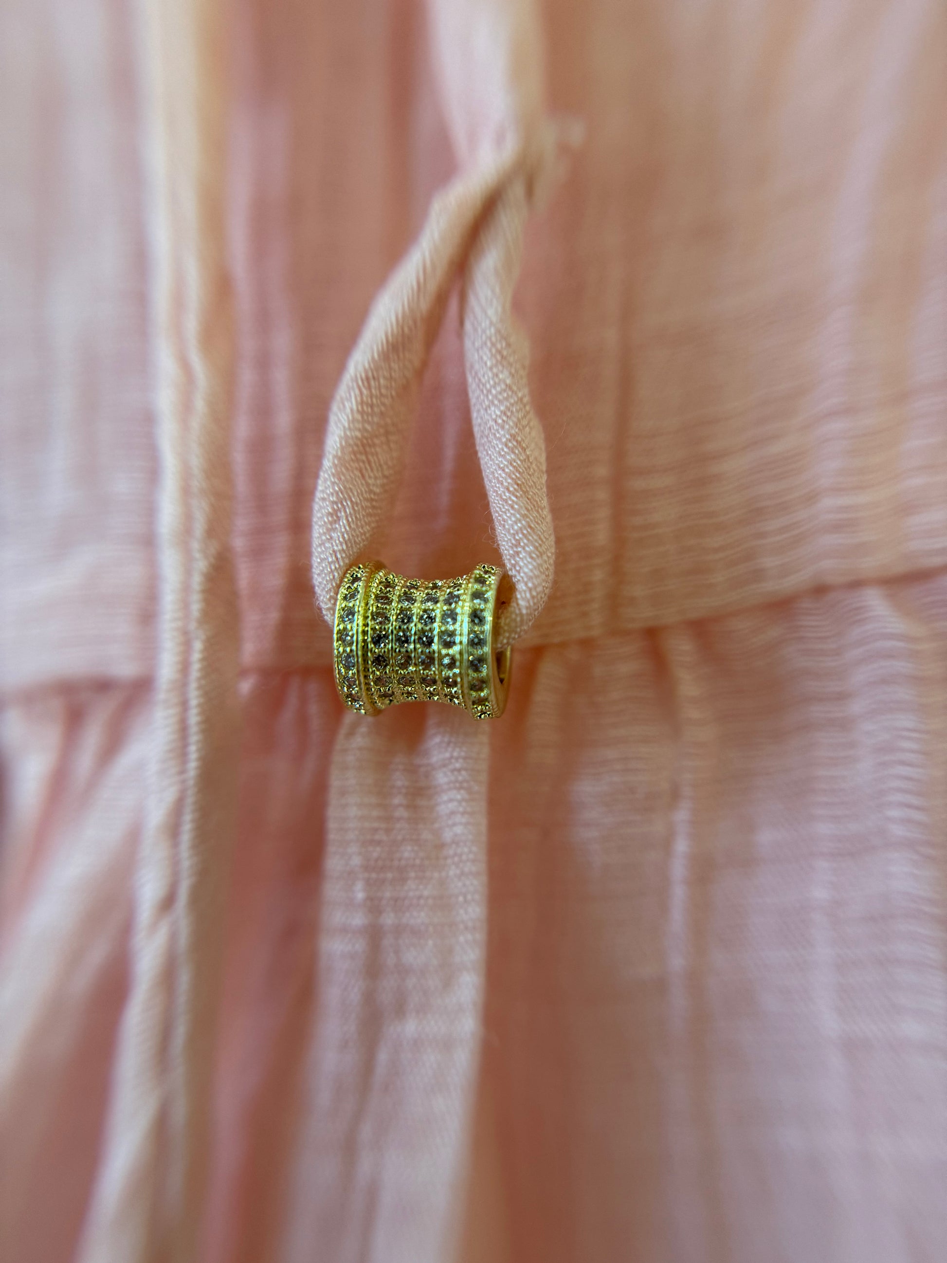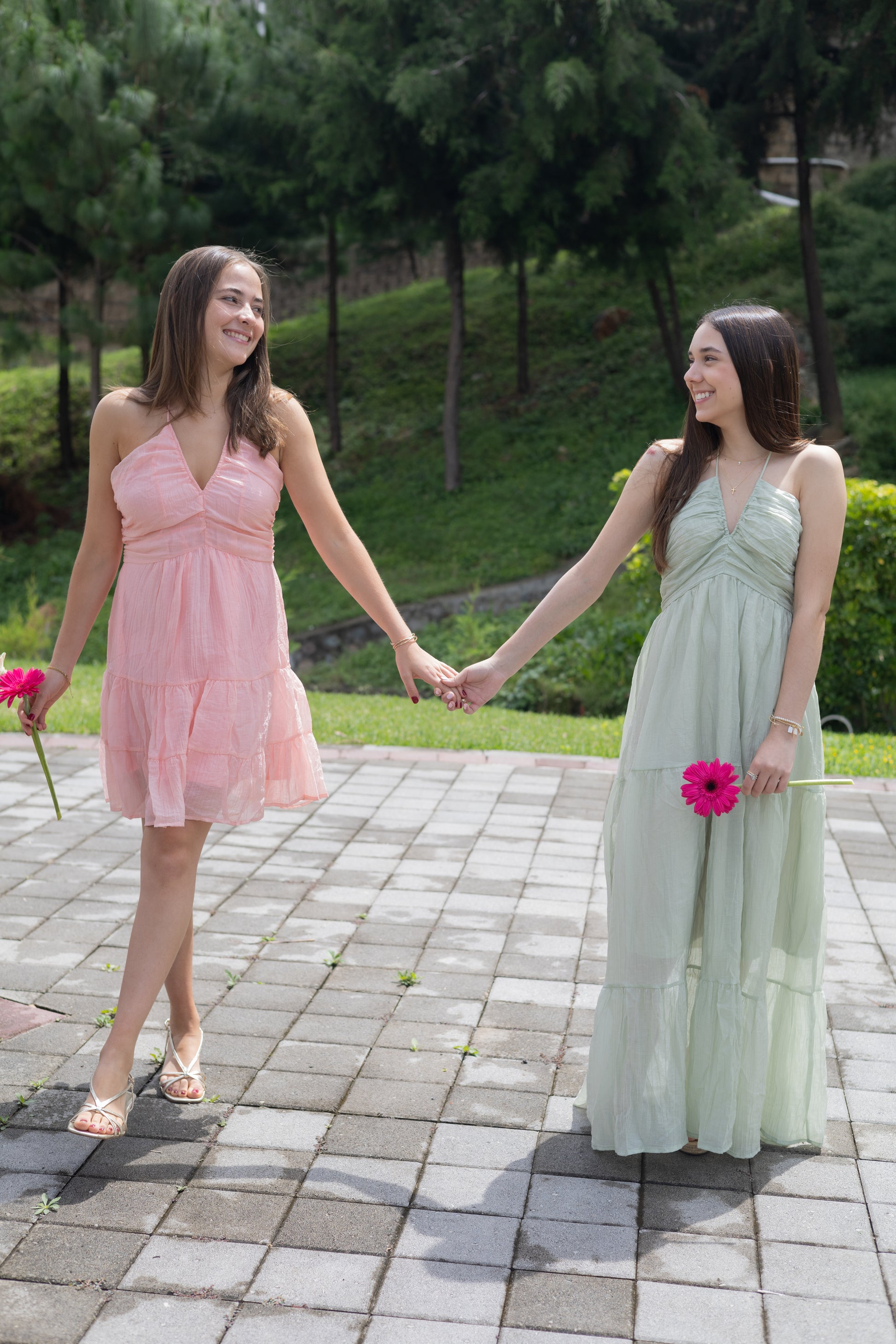 Vestido color melocotón, confeccionado en tela ligera y delicado efecto arrugado natural, que aporta frescura y movimiento. Diseño de escote en V con frunces en el busto, tirantes delgados con detalles dorados y circonias, como colgantes del lazo. Con una silueta imperio y falda amplia por la rodilla, añade un toque romántico y bohemio, ideal para días soleados o eventos casuales.