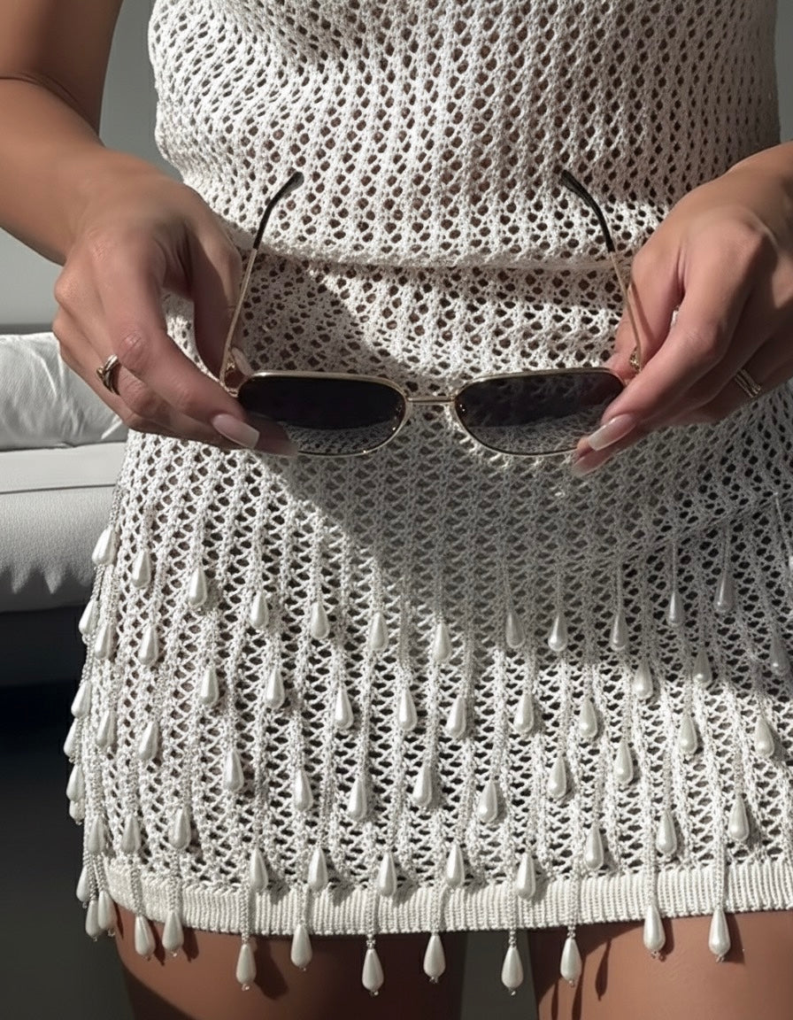 Vestido de crochet (Cover-up) ideal para subir tu look playero a otro nivel. Confeccionado con sofisticado diseño de perlas en forma de lágrimas, añade movimiento y feminidad, con fino tejido fresco y espalda descubierta, para lucir sobre tu bikini en los días de sol, crucero o fiesta en la playa.
