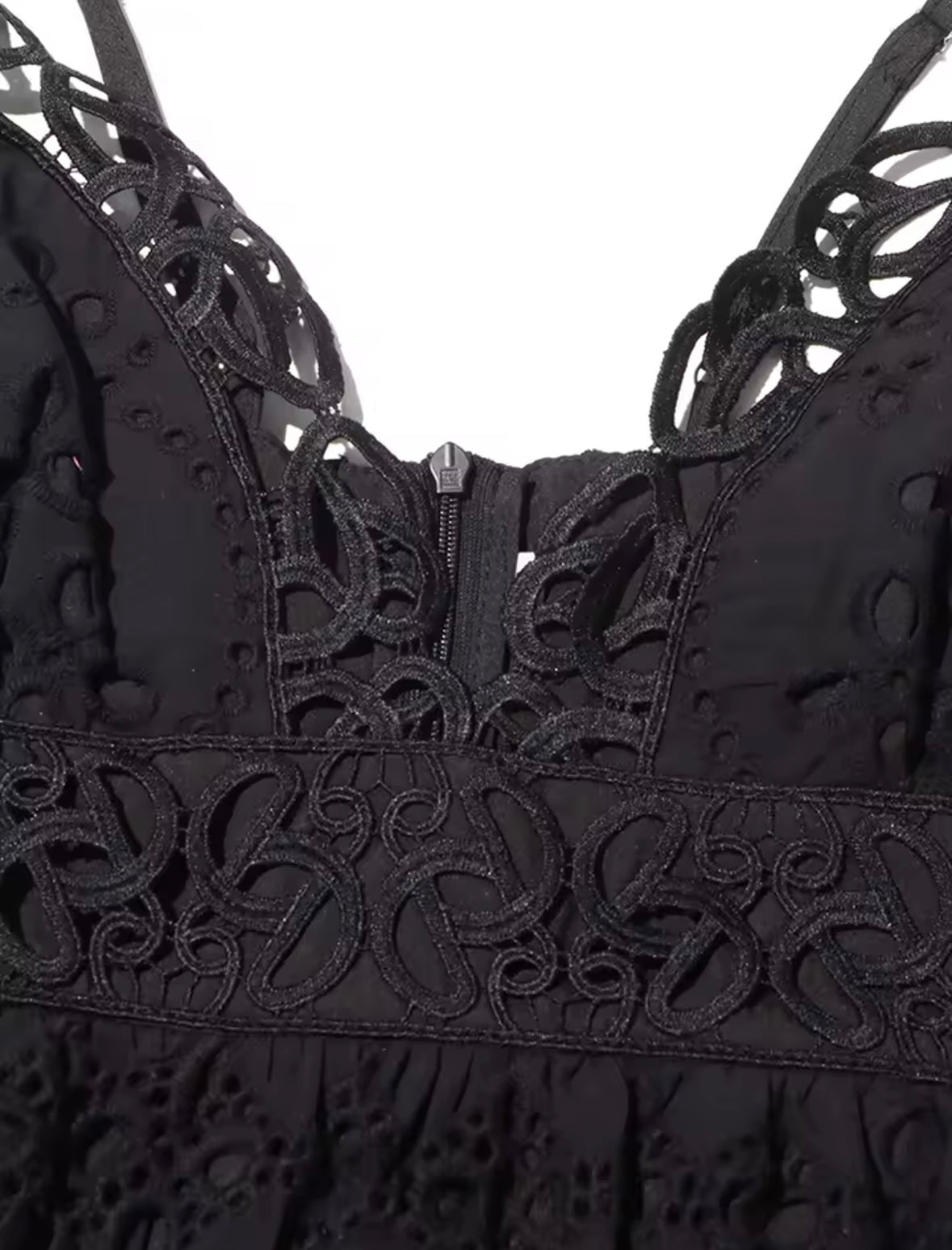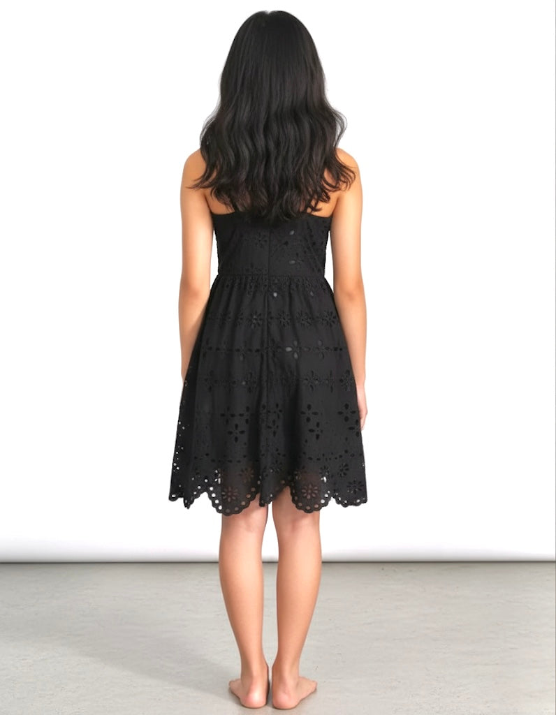 Hermoso vestido casual o de playa confeccionado en algodón con Broderie decorativo. En el escote luce también un delicado trabajo de encaje Guipur que realza el torso, logrando que este delicado vestido realce el look que escojas llevar.