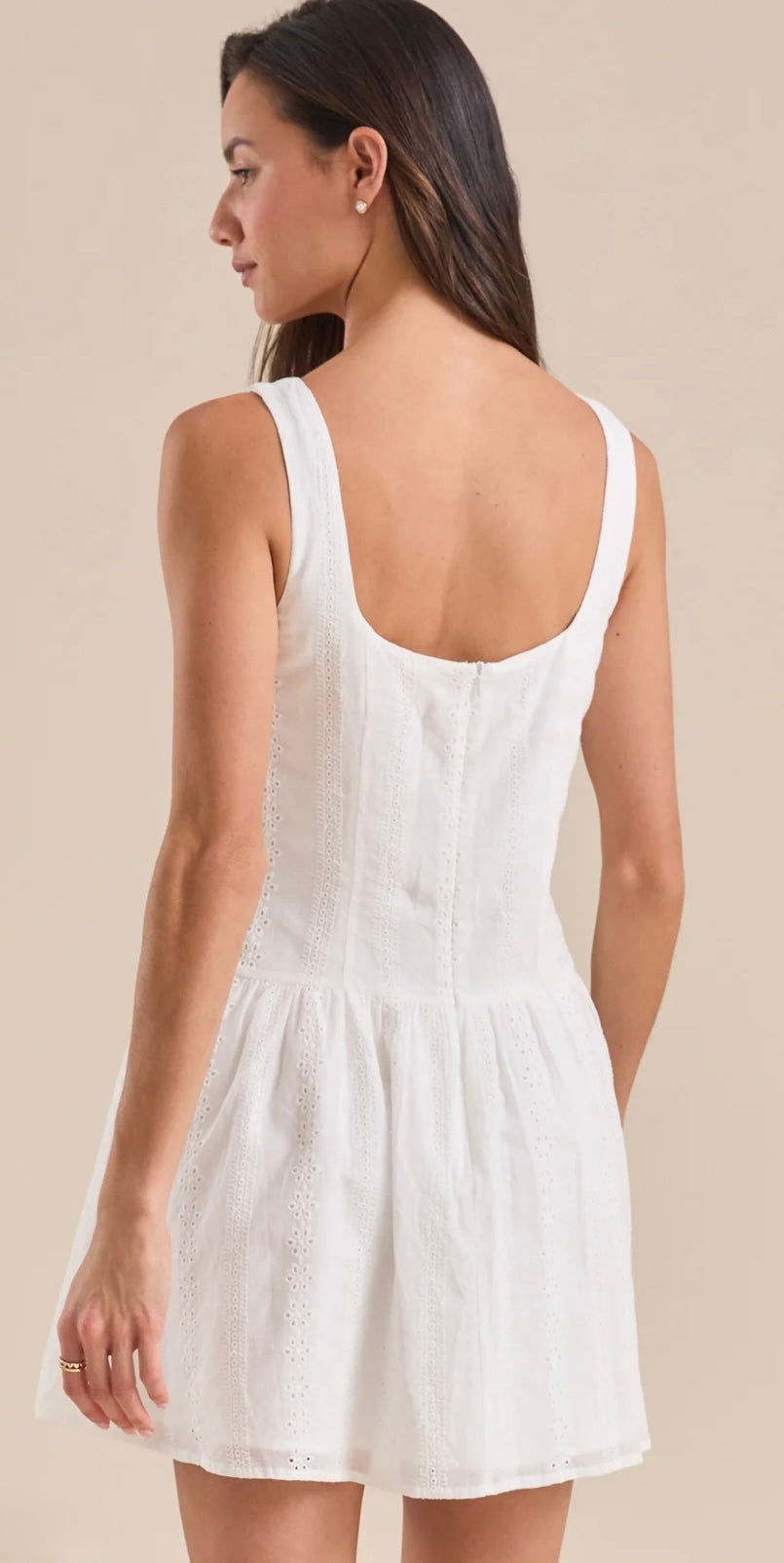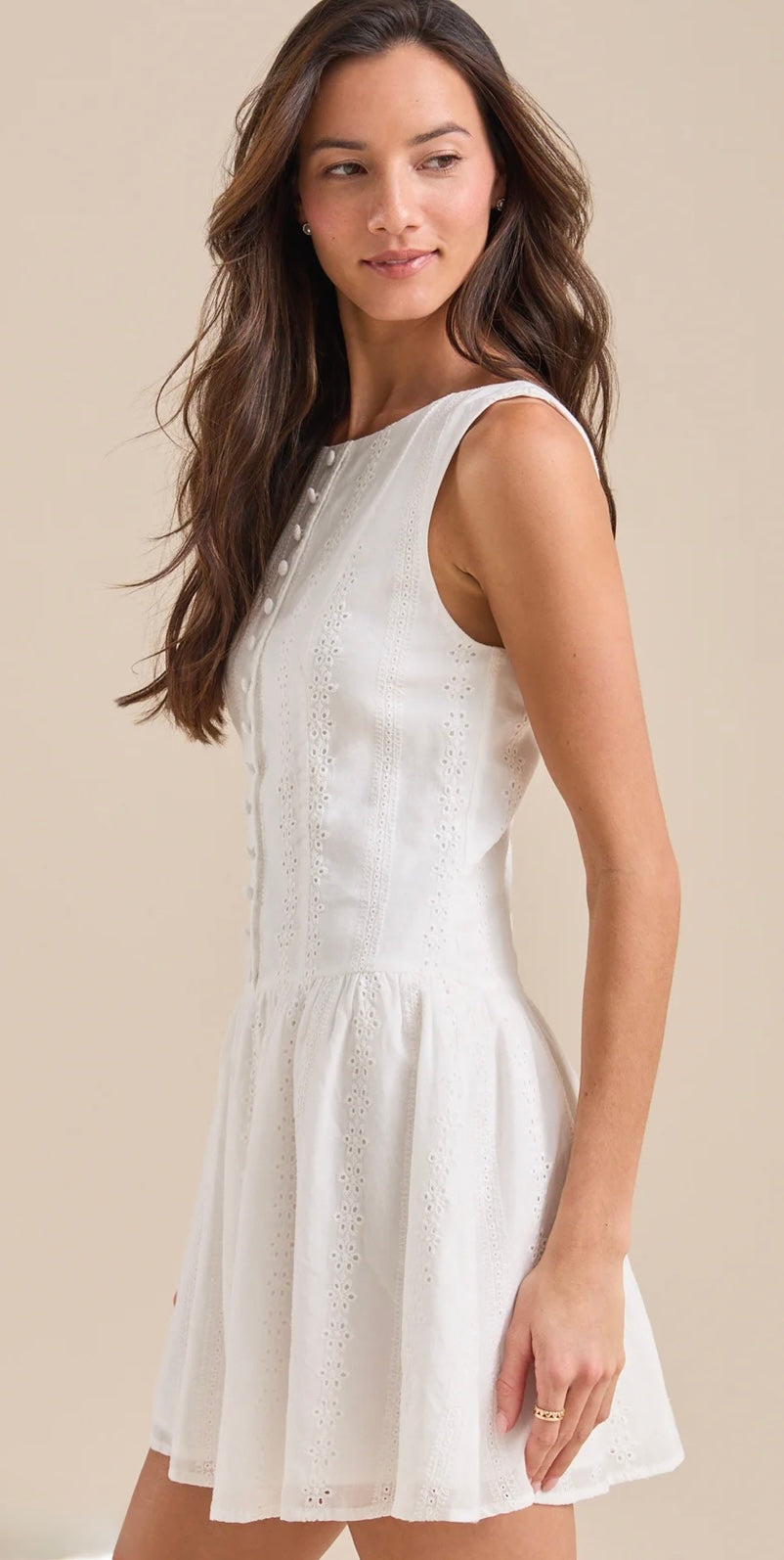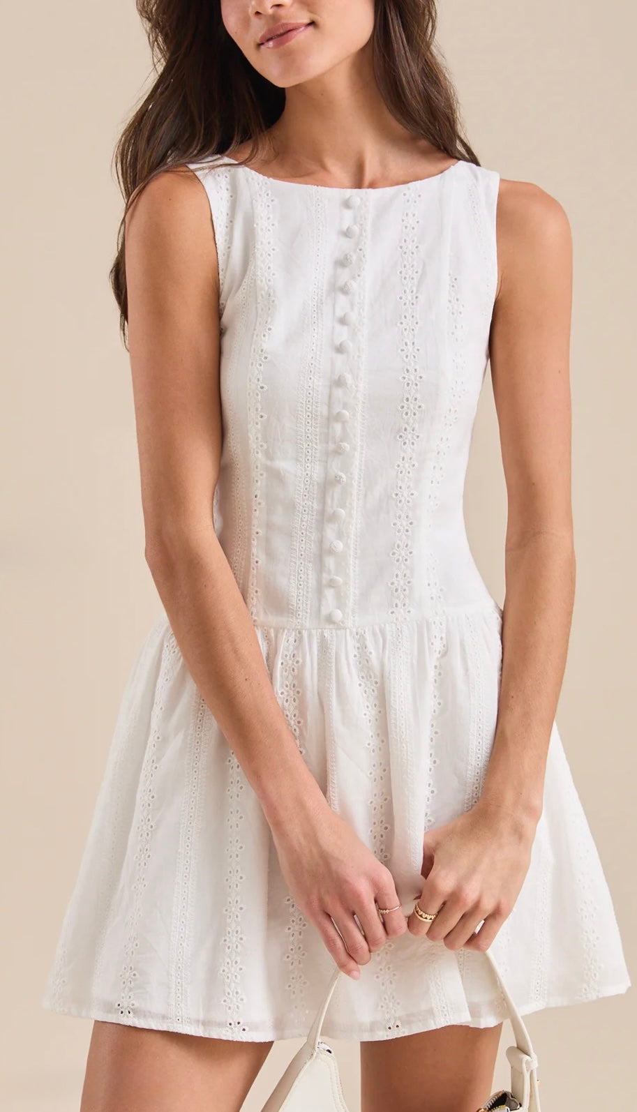 Precioso vestido mini, blanco, confeccionado en "broderie" 100% algodón. Este vestido es un sueño de feminidad veraniega que te acompañará en todas las ocasione bajo el sol.