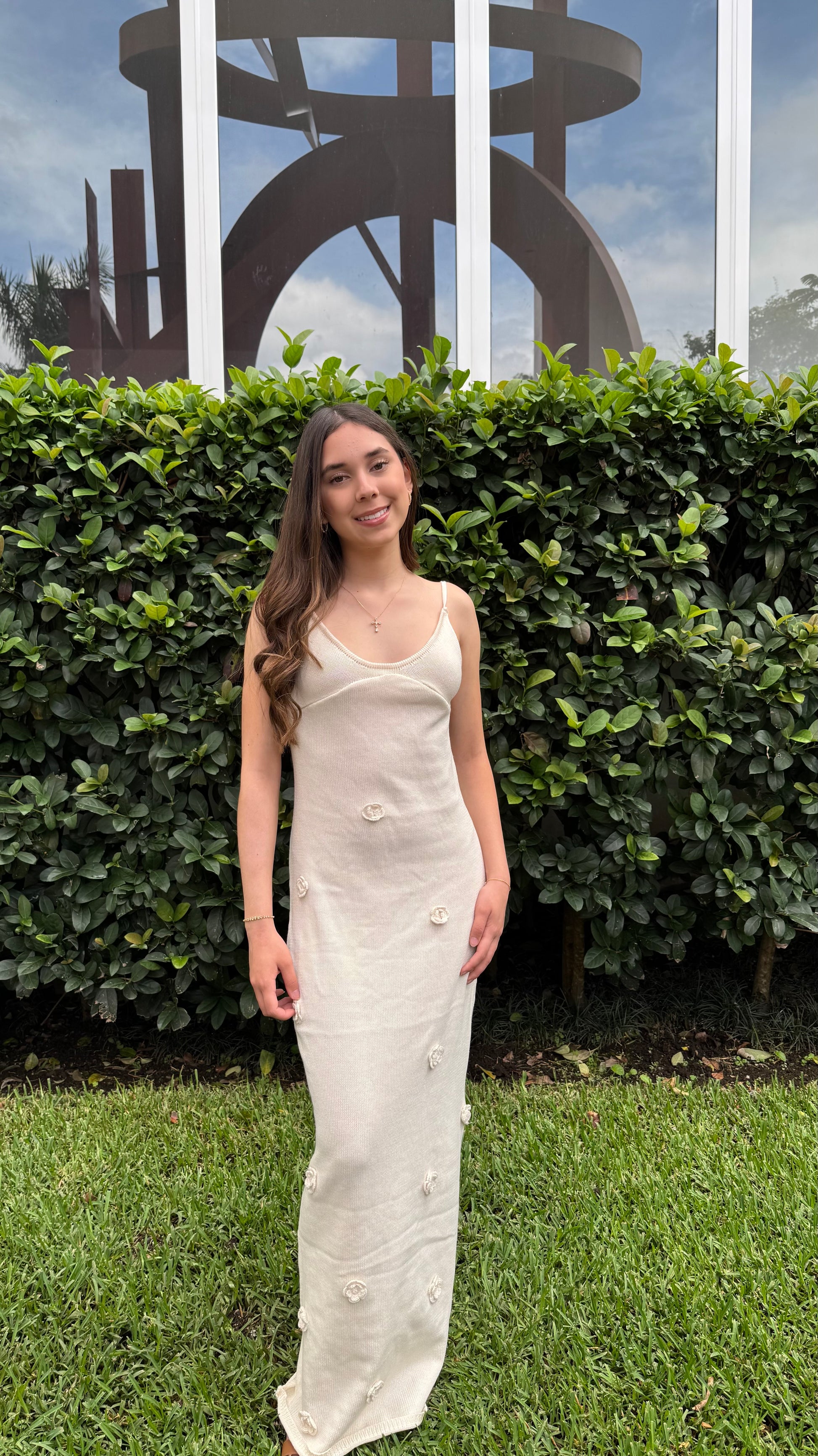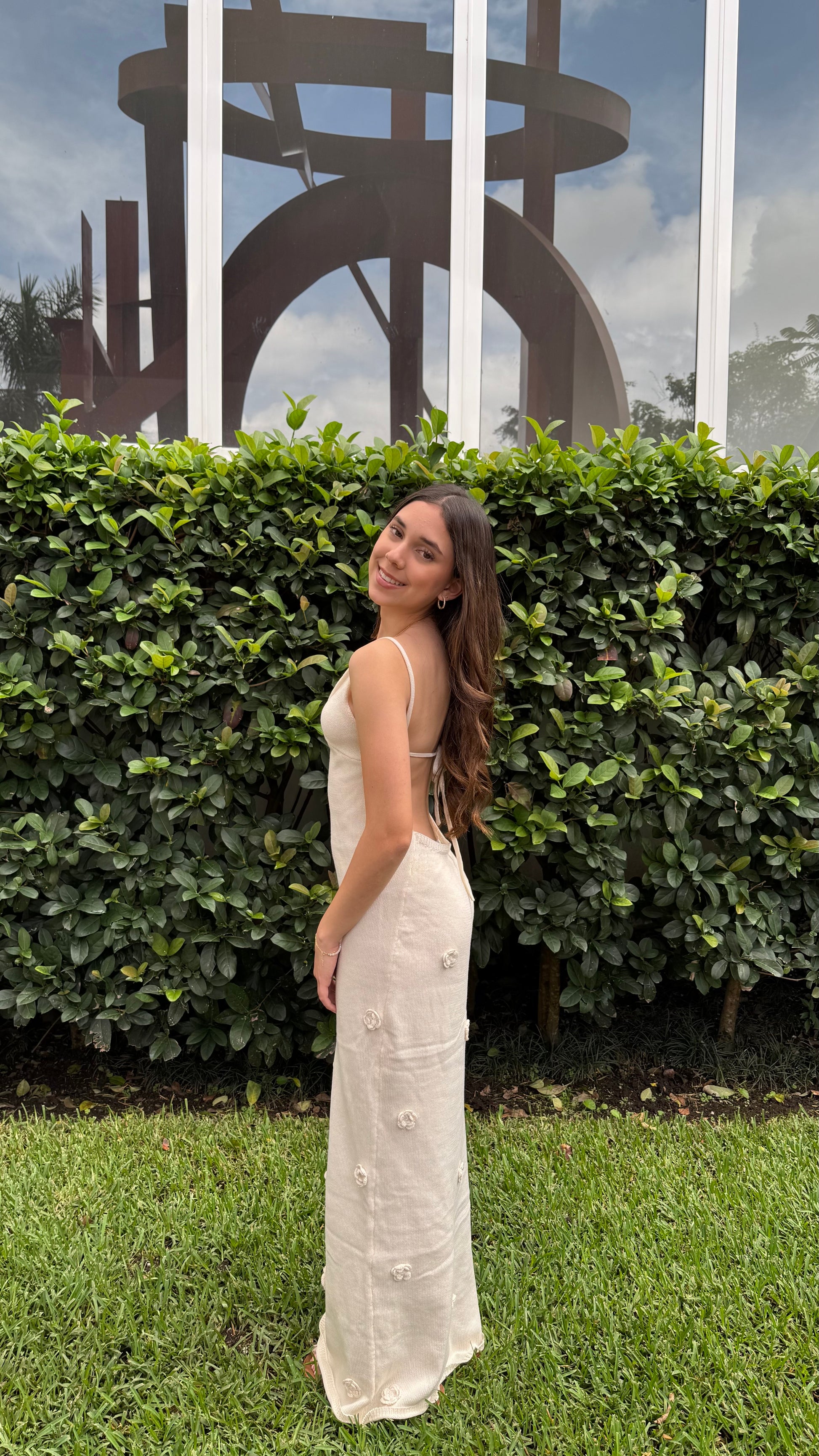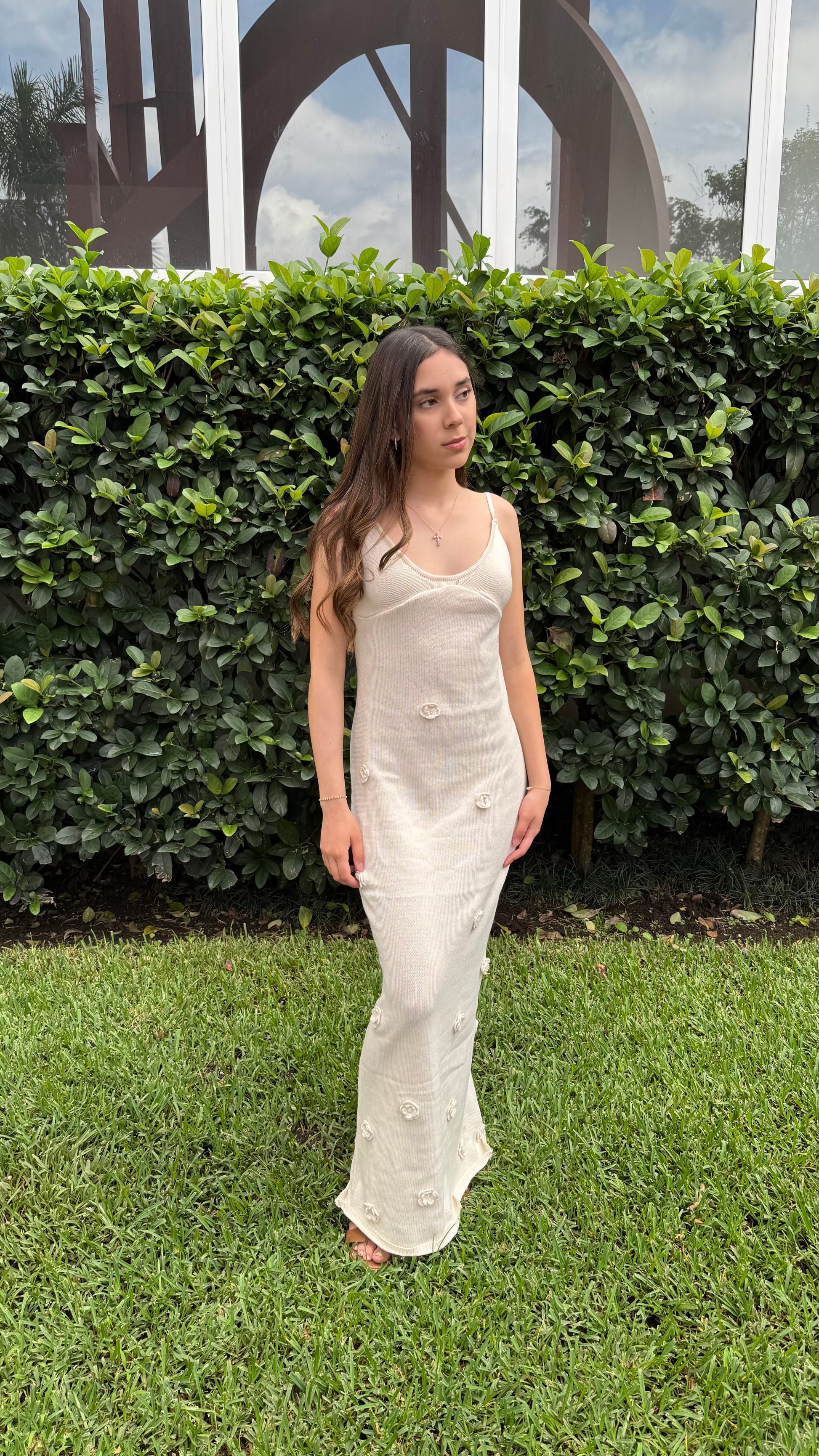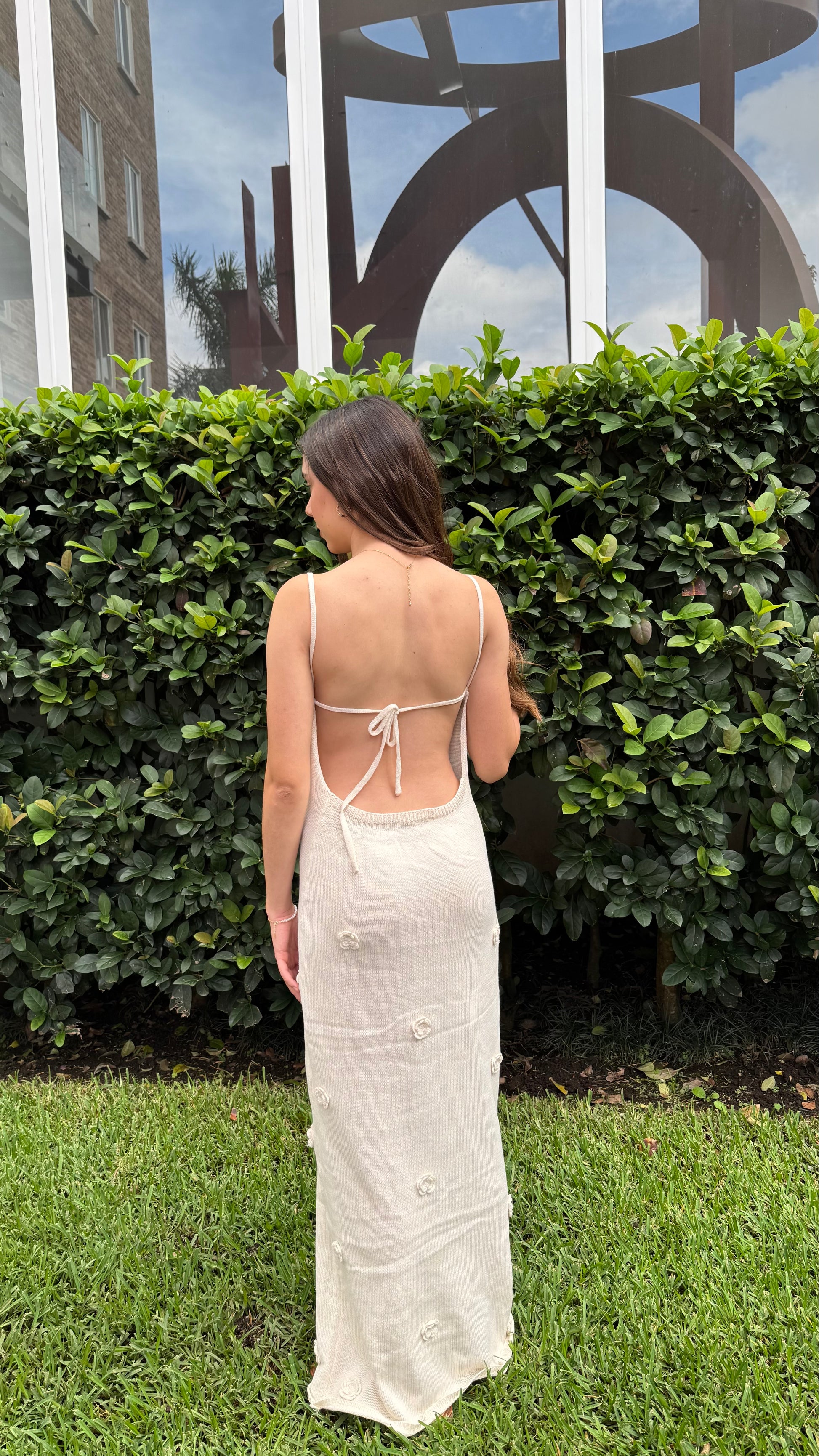 Su espalda descubierta con tiras ajustables aporta un toque juvenil y femenino, mientras que los pequeños apliques florales, tejidos a lo largo del vestido, añaden un aire romántico y bohemio. Ideal para paseos al atardecer, una cena frente al mar o cualquier momento donde busques lucir una belleza natural.