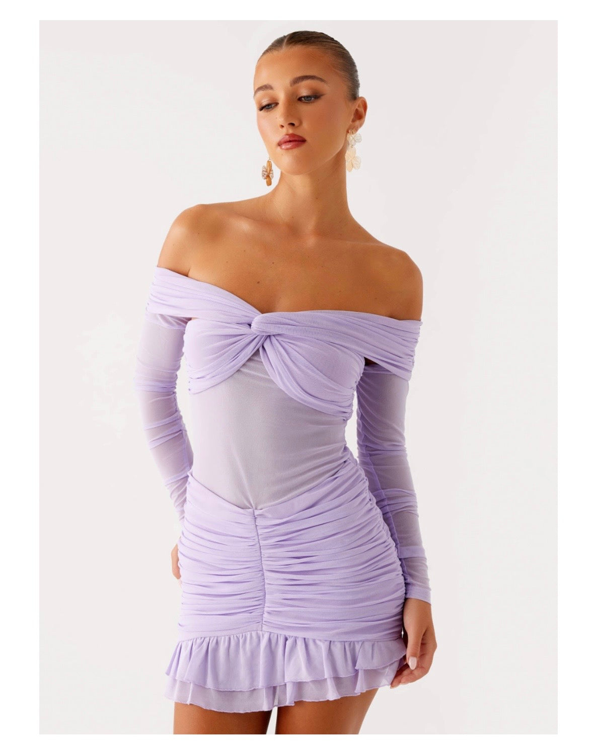 PEPPERMAYO: El vestido Tiff Long Sleeve Mini es la combinación perfecta entre un estilo atrevido y elegante. Con su escote off-shoulder y tela de malla elástica ajustada al cuerpo, este vestido aporta una vibra de autenticidad mientras consigues un look chic sin esfuerzo.